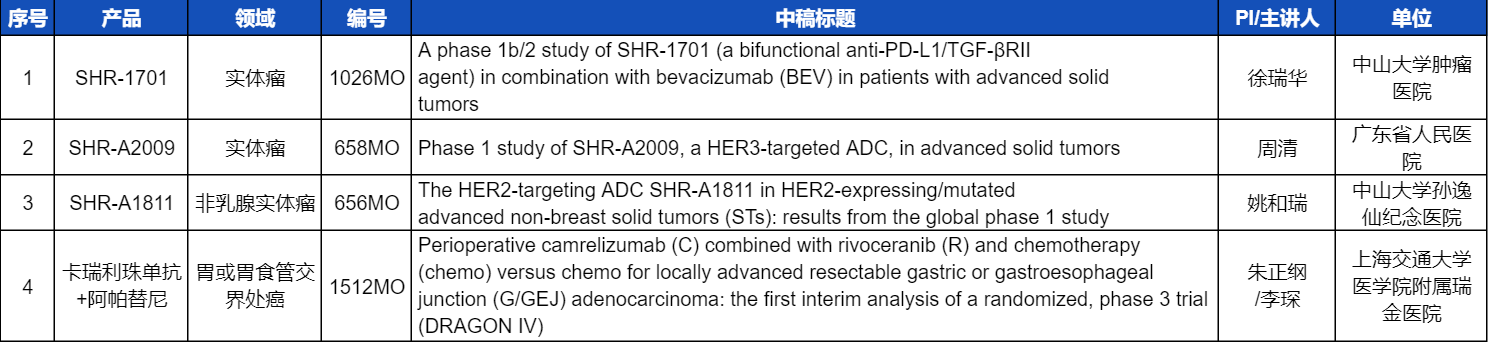 本次ESMO大会,将由中山大学肿瘤医院徐瑞华教授、广东省人民医院周清教授、中山大学孙逸仙纪念医院姚和瑞教授、上海交通大学医学院附属瑞金医院李琛教授分别就4项DB真人医药创新产品相关研究做口头报告,包括SHR-1701、SHR-A2009、SHR-A1811这3款未上市创新产品的实体瘤治疗临床研究,以及1项“双艾”组合(卡瑞利珠单抗联合阿帕替尼)治疗局部晚期可切除胃/胃食管交界处癌的Ⅲ期临床试验期中分析。